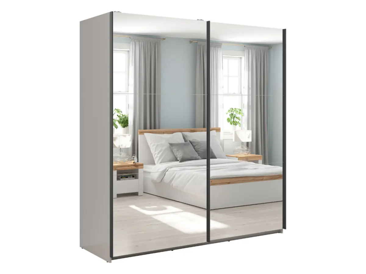 Drzwi przesuwne z lustrem optycznie powiększają i rozjaśniają sypialnię. Wnętrze w odcieniu szarego lnu dodaje szafie dyskretnej elegancji, która idealnie pasuje do nowoczesnych aranżacji.
