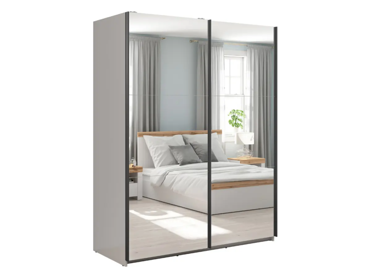 Lustrzane drzwi przesuwne optycznie powiększają i rozświetlają sypialnię. Wnętrze w odcieniu szarej tkaniny dodaje subtelnej elegancji, a kolekcja Tetrix została zaprojektowana tak, aby idealnie komponować się z pozostałymi elementami, tworząc harmonijną sypialnię.