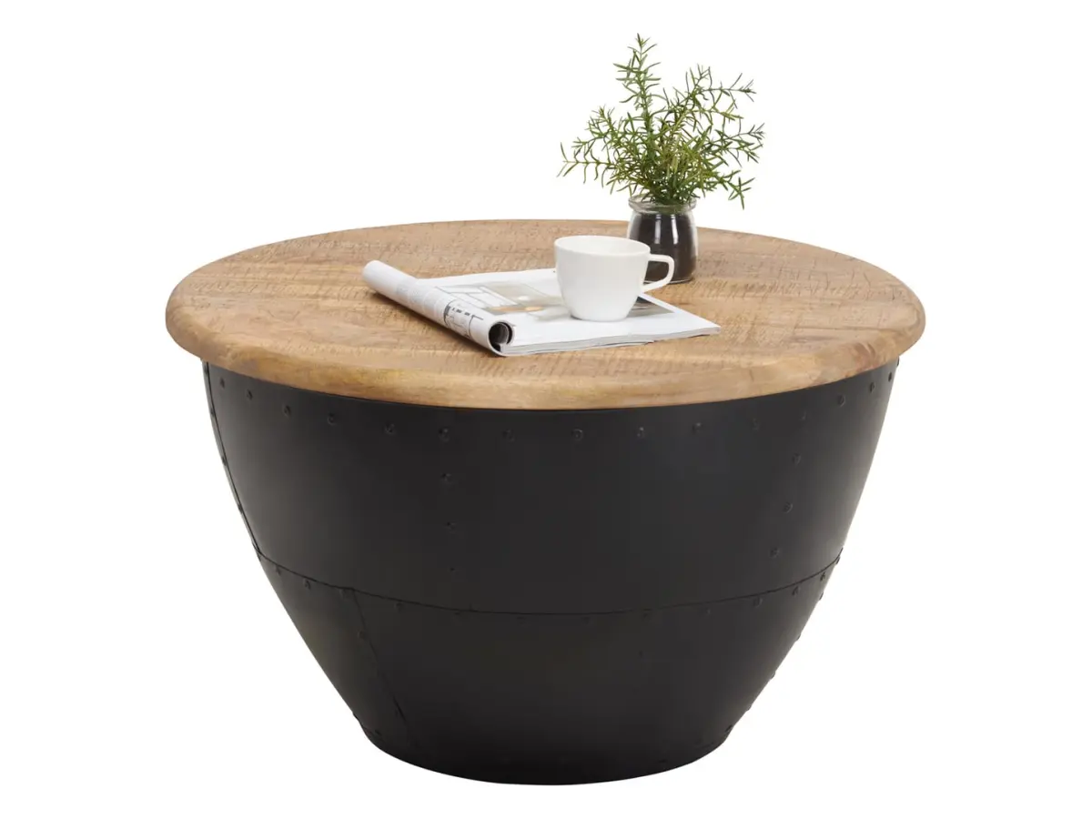 El tablero de madera maciza de mango, con su veta natural única, contrasta con la base de metal negro mate para crear ese estilo loft que transforma cualquier salón. La forma redonda invita a moverse libremente alrededor de la mesa y la convierte en el punto focal natural de tu zona de descanso.