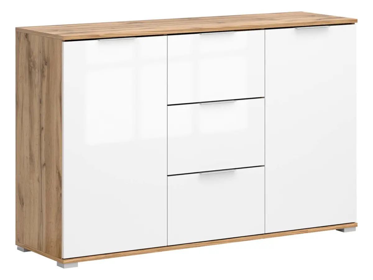 Cómoda Zele 135 cm con 2 puertas y 3 cajones roble wotan/blanco brillo