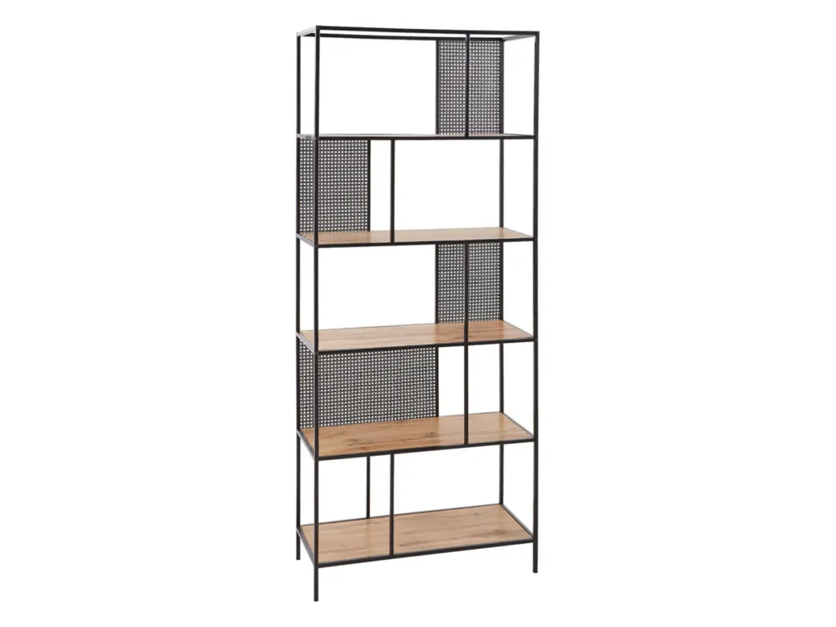 La estantería Leon combina acero con recubrimiento en polvo y un acabado en color roble: una mezcla que captura perfectamente la esencia del estilo industrial loft. Los paneles traseros con rejilla de mimbre vienés le aportan carácter y personalidad, convirtiéndola en una pieza que no pasa desapercibida.