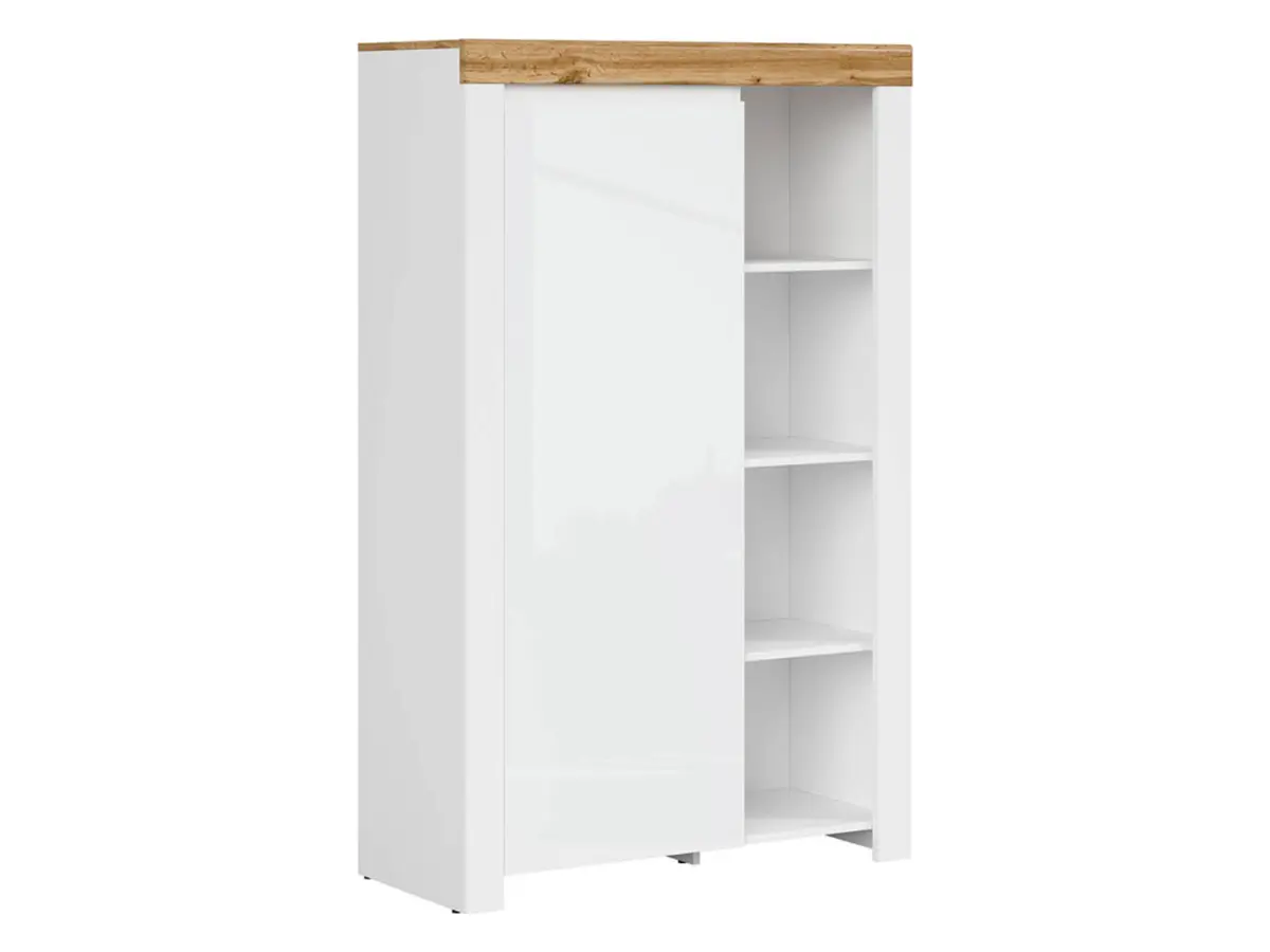 La estantería Holten combina con elegancia el acabado roble wotan del tablero superior con un cuerpo en blanco mate y frentes lacados en blanco brillante con efecto espejo. El resultado es una pieza moderna y luminosa que aporta carácter sin restar protagonismo al resto de la estancia.