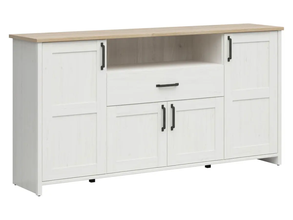 Cómoda Loksa 194 cm con 4 puertas, cajón y estante, pino andersen blanco/roble grandson
