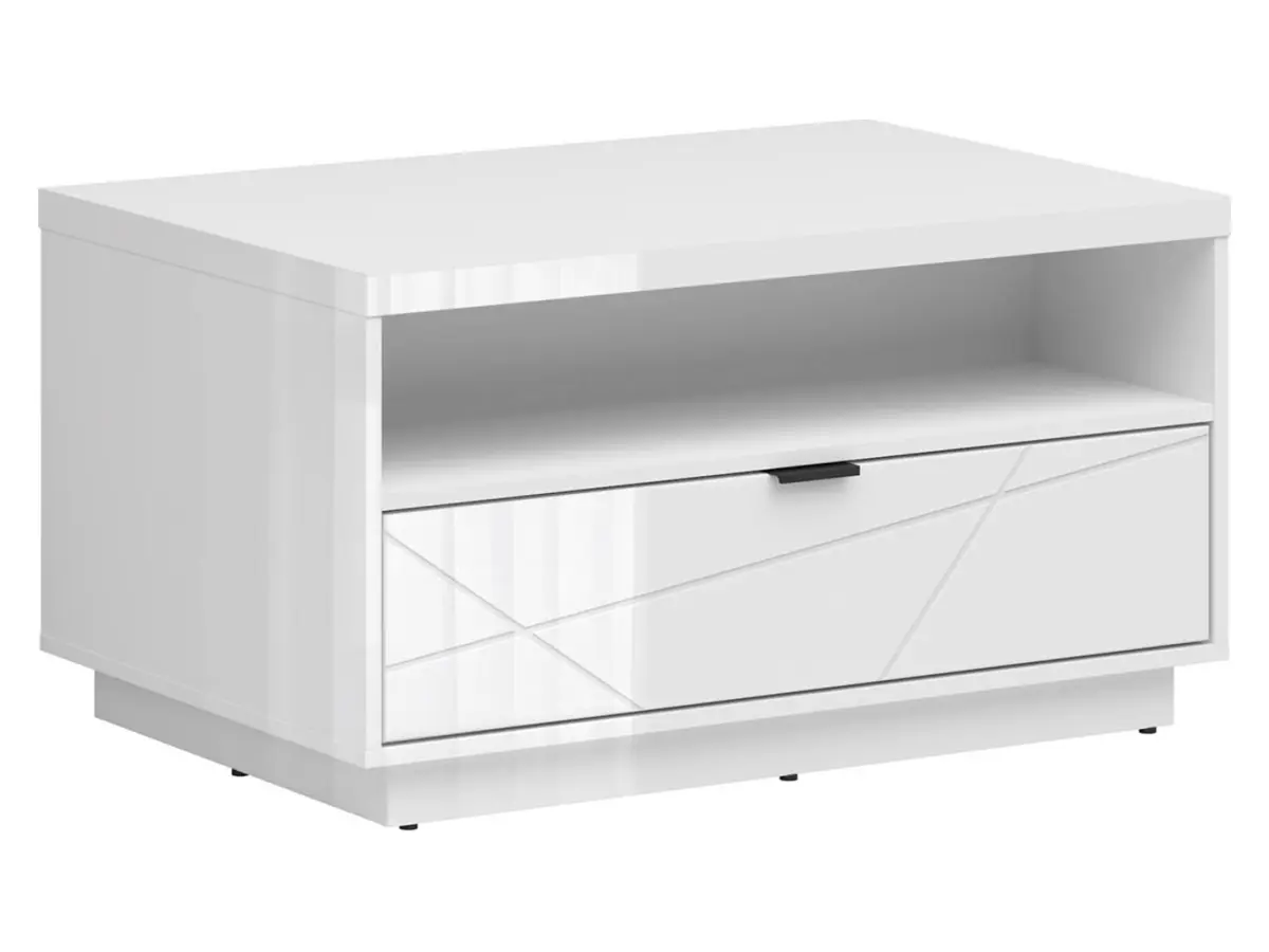 Un cajón con cierre silencioso permite tener a mano todo aquello que no quieres dejar a la vista: el mando, las llaves o las gafas. La balda inferior es perfecta para revistas o libros. El tablero lacado y engrosado resiste el uso cotidiano sin perder su atractivo original.
