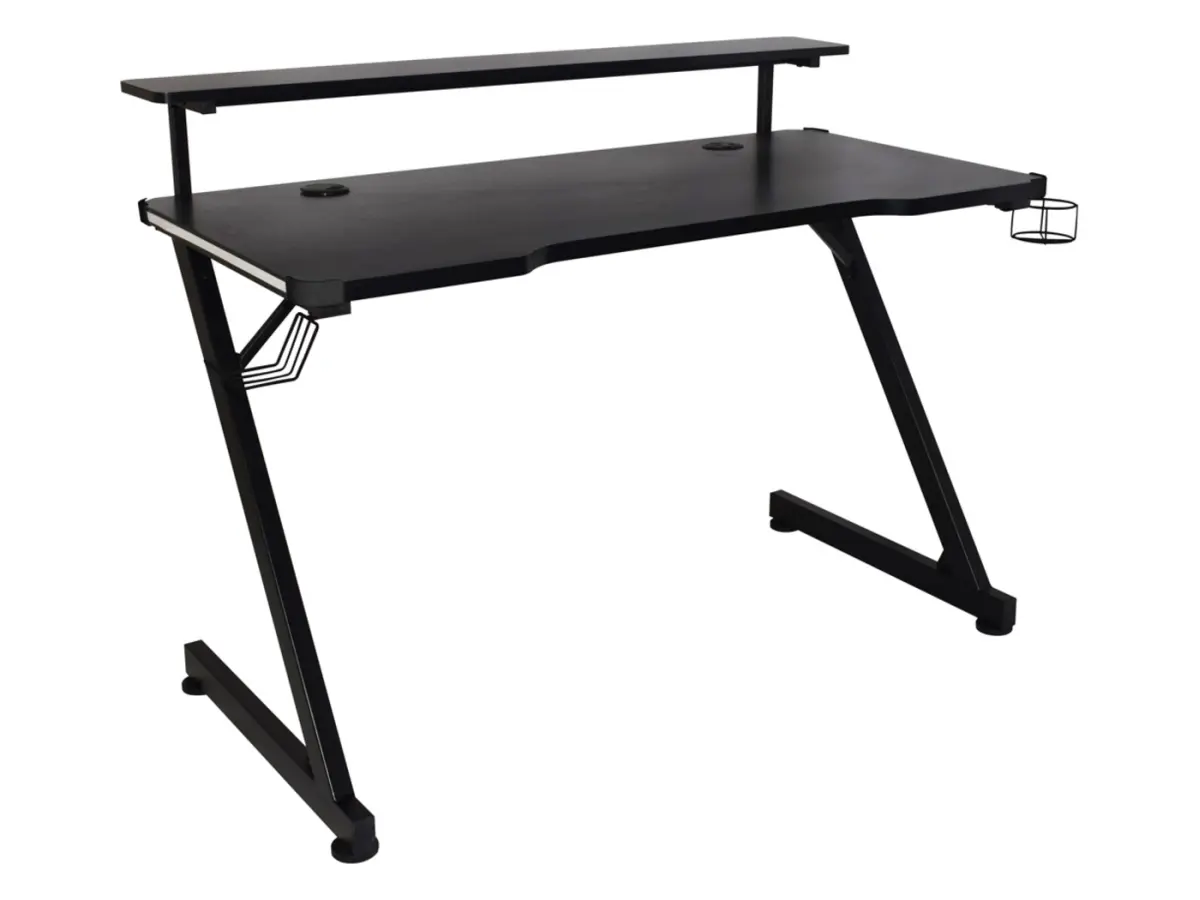 El negro intenso, combinado con inserciones rojas dinámicas, le aporta un carácter deportivo y enérgico. Un escritorio que no solo es funcional, sino que transforma visualmente cualquier rincón en una verdadera estación de juego.