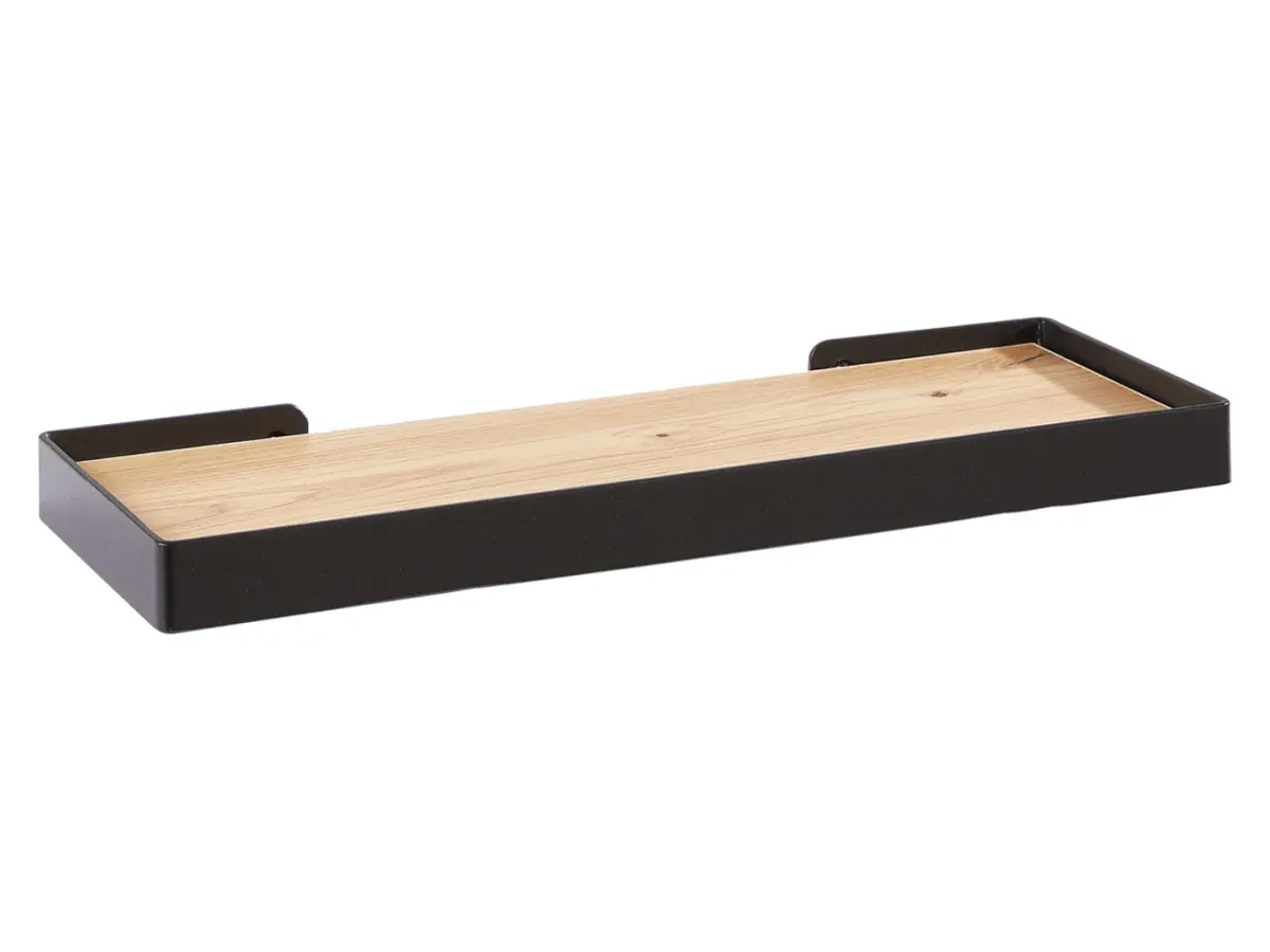El negro intenso de la estructura metálica crea un contraste limpio y elegante sobre paredes claras. Su perfil de tan solo 3 cm de alto le da un aspecto ligero y moderno, ideal para complementar muebles de madera o ambientes nórdicos y minimalistas.