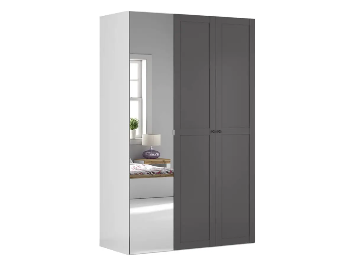 El armario Flex combina un diseño minimalista y moderno con una elegante paleta de colores: cuerpo blanco, frentes en grafito y un espejo integrado en el panel izquierdo que aporta amplitud visual. Los tiradores negros rematan el conjunto con un toque contemporáneo.