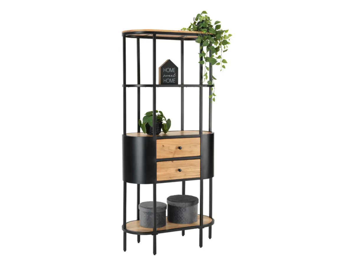 Los estantes abiertos invitan a exponer libros, plantas o piezas decorativas, mientras que los dos cajones mantienen fuera de la vista los objetos cotidianos: documentos, textiles o accesorios. Un mueble que ordena sin ocultar lo que merece ser visto.