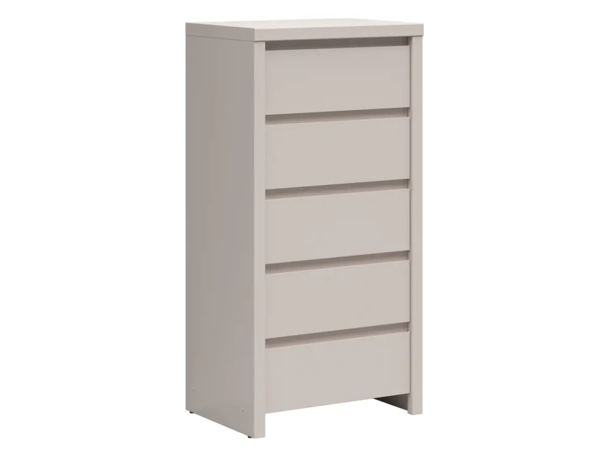 Con solo 56 cm de ancho, esta cómoda cabe donde otras no pueden: en el hueco junto a la cama, en un pasillo amplio o en esa esquina del salón que siempre ha quedado sin aprovechar. Sus cinco cajones ofrecen un almacenaje generoso y bien organizado para el día a día.