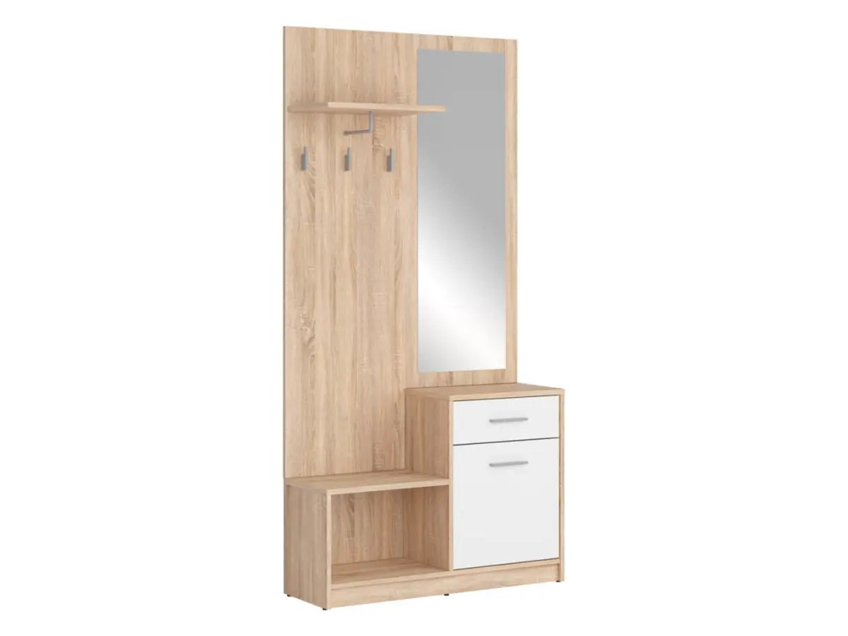 Nepo Plus reúne en un solo conjunto todo lo necesario al llegar a casa: zona para colgar abrigos, zapatero, cajón, perchas, estante superior y espejo. Pensado especialmente para entradas pequeñas, aprovecha cada centímetro sin renunciar al estilo.