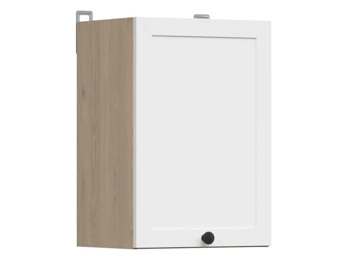 El armario Junona Line combina un cuerpo en tono roble bernstein con una puerta blanca enmarcada y detalles decorativos: una mezcla cálida y atemporal que encaja perfectamente en cocinas de estilo clásico o minimalista.