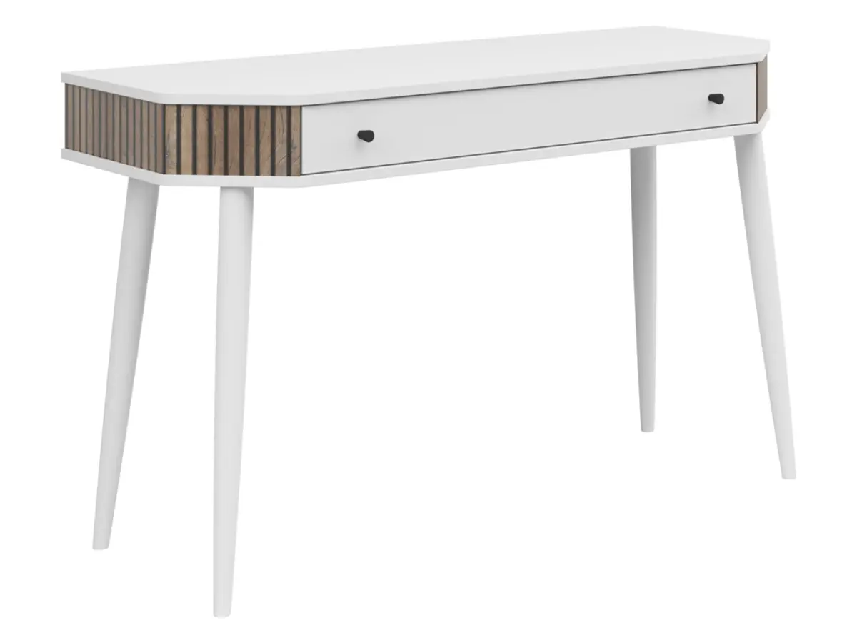 El tocador Capri combina una silueta ligera y natural con una estética escandinava que aporta calidez a cualquier estancia. El elegante blanco del tablero contrasta con los detalles en roble oscuro Flagstaff, mientras que las patas de madera lacadas en blanco rematan el conjunto con una discreta sofisticación. Una pieza que luce igual de bien tanto en un dormitorio como en un recibidor.