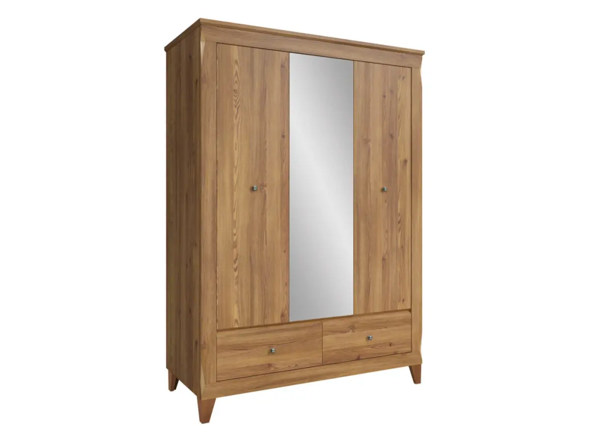 Tres puertas y un interior generoso que ofrece soluciones para cada necesidad: una barra para colgar, estantes para ropa doblada y cajones para los objetos personales. Y para ese último vistazo antes de salir, un frente con espejo que hace el armario aún más práctico.