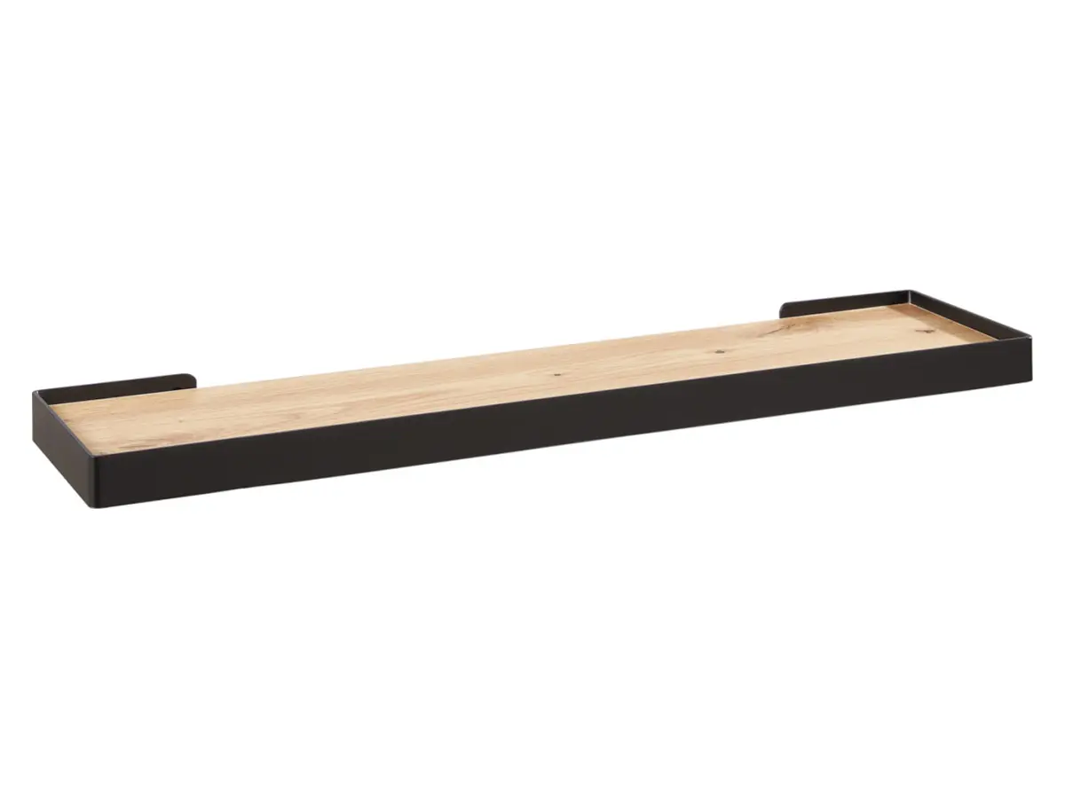 El marco metálico negro aporta un contraste limpio y moderno sobre paredes claras, y combina muy bien con muebles de madera o acabados naturales. Con solo 3 cm de altura, el estante se integra en el espacio con una presencia ligera y discreta, sin robar protagonismo al resto de la decoración.