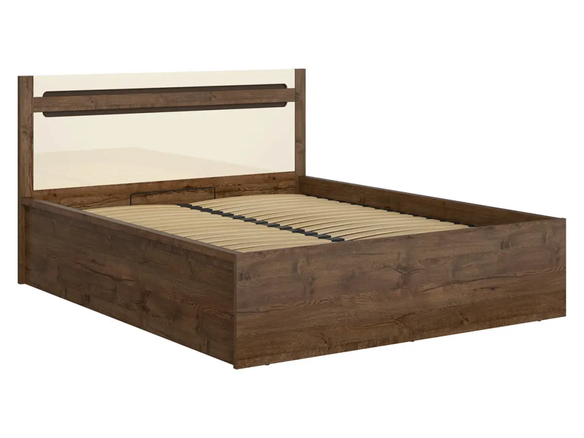 La cama Ruso combina dos acabados que se complementan a la perfección: el cálido roble April en la estructura y un cabecero en blanco perla de alto brillo que aporta luminosidad. Incluye un listón en lava mate para montar en los huecos del cabecero, añadiendo un elegante detalle de contraste.