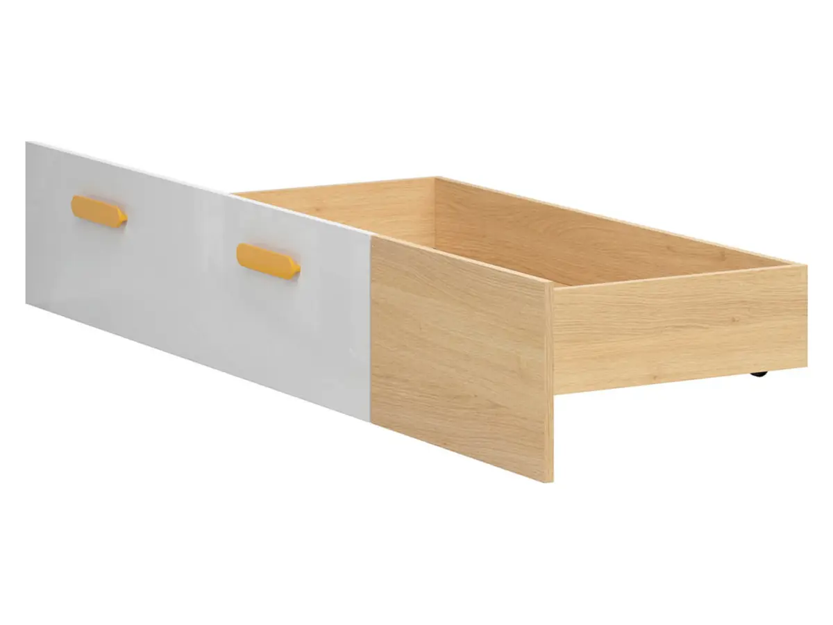 El cajón Wesker combina el cálido acabado en roble polaco con un frontal en blanco lacado brillante: una mezcla fresca y moderna que encaja perfectamente tanto en habitaciones infantiles como en dormitorios juveniles. Dos cómodos tiradores amarillos aportan un toque de color y personalidad.