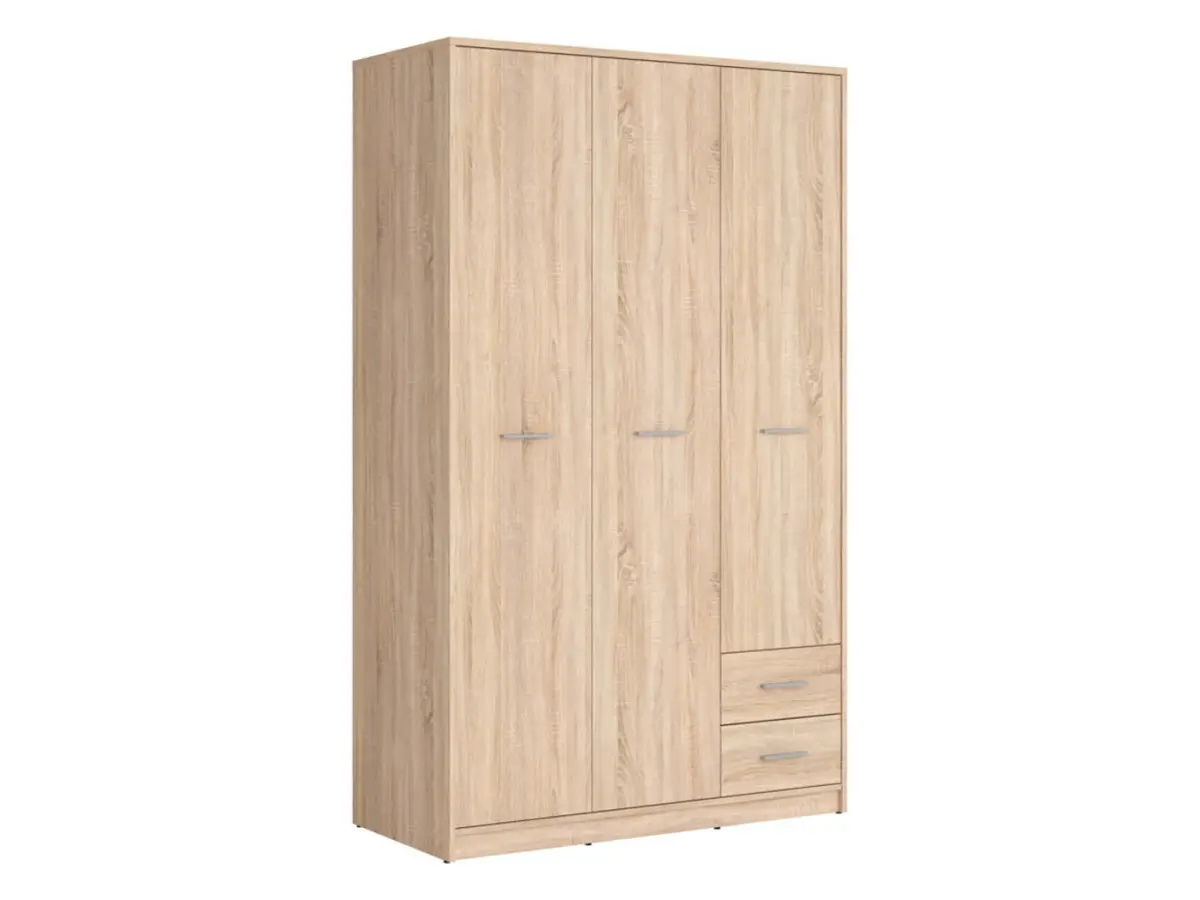 Tras sus tres puertas hay espacio para todo: ropa colgada, doblada y los pequeños accesorios que suelen perderse. Dos barras para perchas, dos estantes superiores y dos cajones compactos: un lugar para cada cosa.