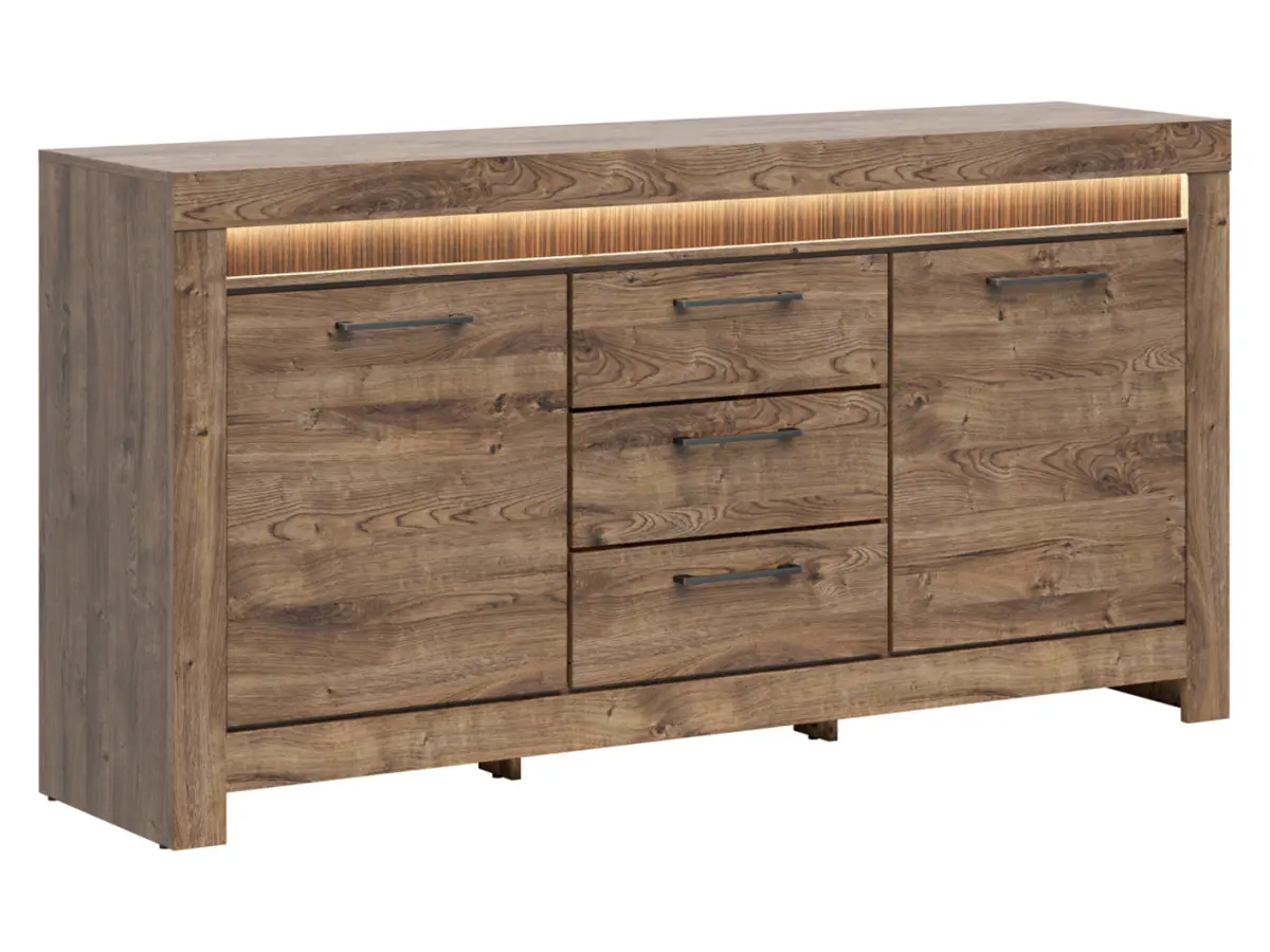 La cómoda Torin combina la calidez del estilo clásico con un carácter contemporáneo y robusto. Sus laterales reforzados y los tiradores metálicos le confieren una presencia firme, mientras que el friso acanalado en color roble wenge magia —realzado por una iluminación LED de bajo consumo— añade un toque de distinción que transforma cualquier salón.