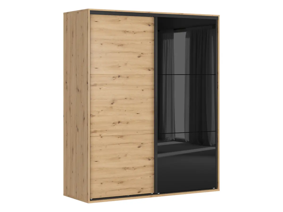 El contraste entre los frentes lacados en negro brillante (Lacobel) y el cuerpo en roble artisan crea una combinación que atrapa todas las miradas. Funciona a la perfección en interiores modernos, de estilo loft o glamour: esa tensión entre la intensidad del negro y la calidez de la madera es lo que hace especial a este armario.
