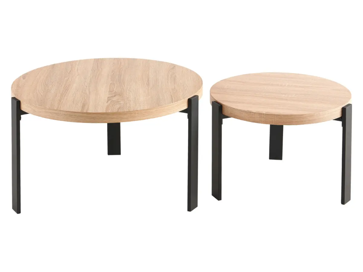 El cálido acabado en madera de roble contrasta con las patas metálicas negras, creando el equilibrio perfecto entre lo acogedor y lo contemporáneo. Su forma redonda aporta ligereza visual y permite que estas mesas encajen con naturalidad en estilos escandinavos, loft o clásicos.