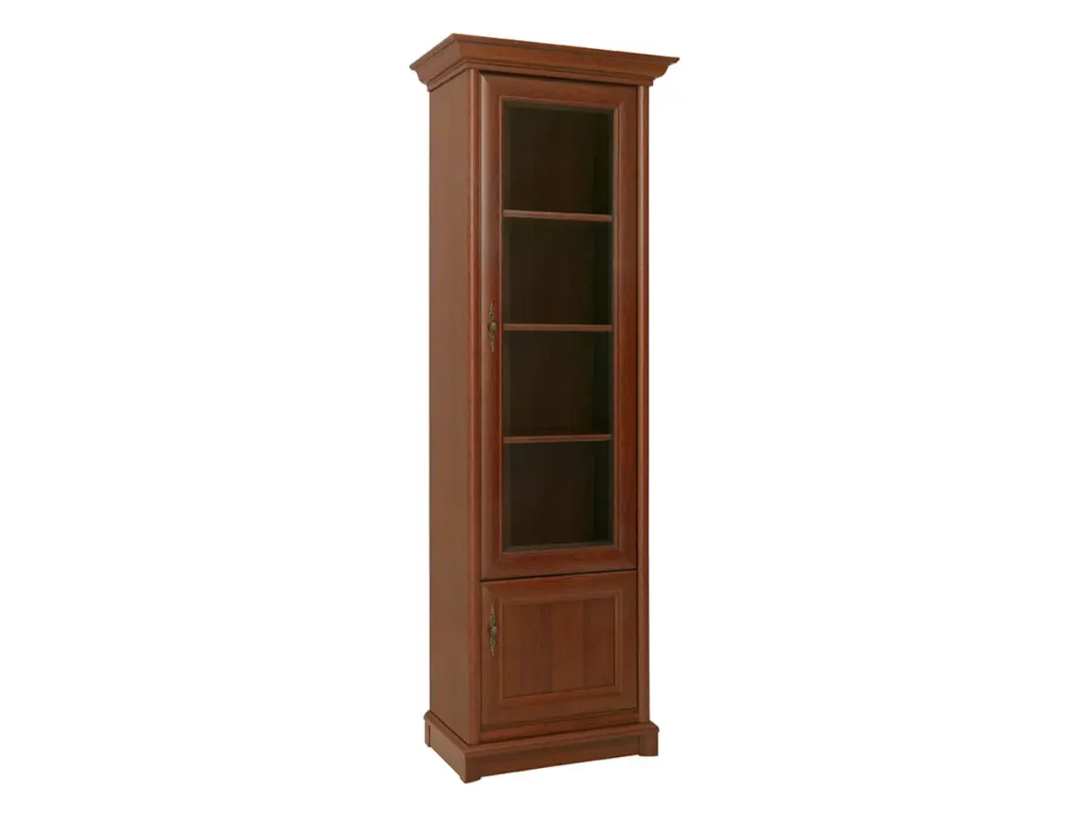 La vitrina Kent tiene un aire atemporal que encaja tanto en un salón clásico como en un despacho con carácter. El acabado en tono castaño cálido imita a la perfección la veta y textura de la madera natural, aportando una calidez genuina a cualquier rincón. Los tiradores de estilo joyero y los remates tallados le dan ese toque de distinción que la hace inconfundible.