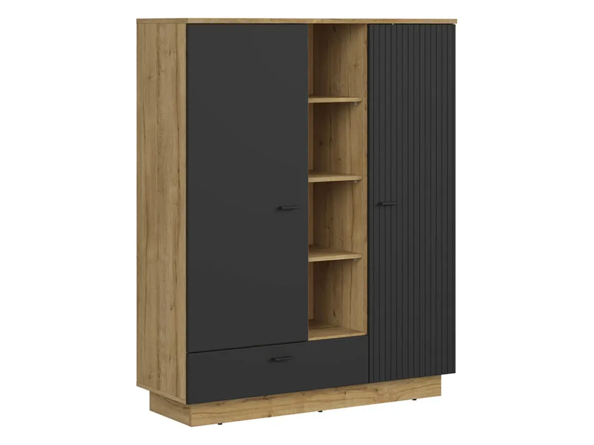 El cuerpo en cálido roble Waterford, junto con los frentes en negro mate, crea una combinación moderna y con carácter propio. La puerta derecha cuenta con fresados verticales que imitan lamas, aportando un relieve tridimensional que convierte a la ZENDA en una pieza verdaderamente especial. Es perfecta para un salón amplio, un estudio acogedor o incluso un dormitorio.