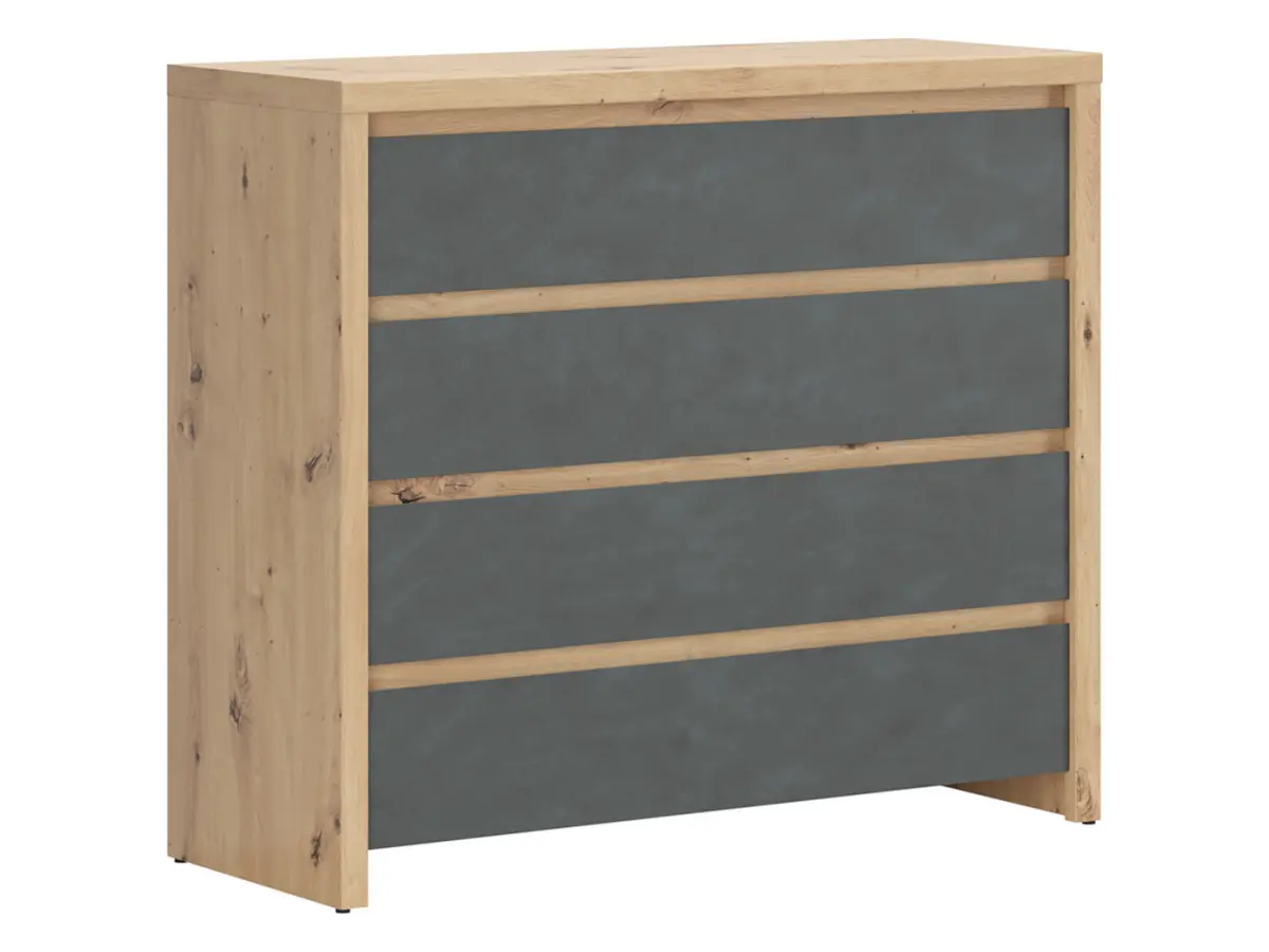 La cómoda Larios destaca por su combinación de dos acabados que se complementan a la perfección: el cuerpo y la superficie en roble Artisan, con su cálida veta natural, y los frentes en un moderno gris cepillado que aporta una sofisticación contemporánea. El resultado es un contraste elegante que no pasa desapercibido.