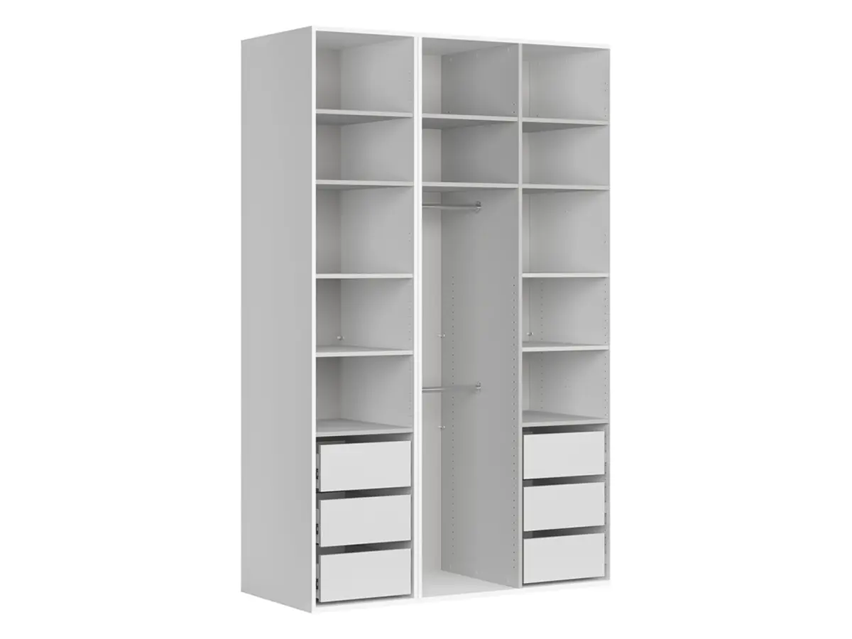 Con unas dimensiones totales de 150 × 240 × 66 cm, este conjunto de dos módulos aprovecha la altura de la habitación sin ocupar demasiada superficie; ideal incluso para dormitorios de tamaño medio.