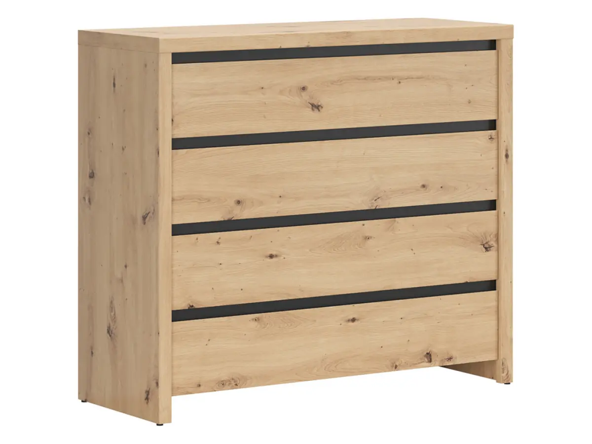 El roble artisan cálido y las listas negras crean una combinación elegante y actual. La cómoda Larios se adapta igual de bien a un salón contemporáneo que a un dormitorio de estética clásica; es una de esas piezas que encajan sin esfuerzo y elevan cualquier espacio.