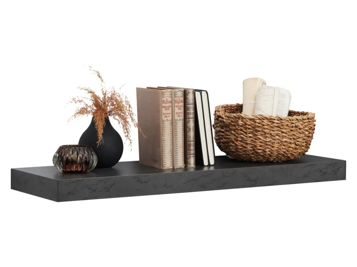 El tono antracita crea un contraste elegante sobre paredes claras y combina a la perfección con maderas naturales y acabados blancos. Su perfil compacto de 5 cm de alto le da una presencia discreta pero definida, ideal tanto en solitario como formando una composición con otros estantes.