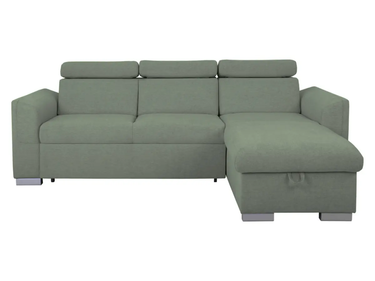 Sofá de esquina universal Evia con función de cama, arcón y reposacabezas ajustables verde