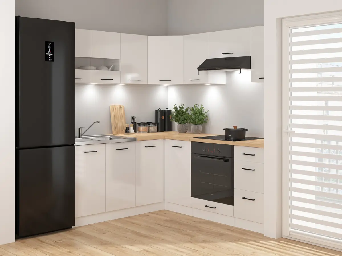 Con unas dimensiones de 218 × 200 cm, Junona Line está pensada para aprovechar el rincón de la cocina al máximo. Las puertas pueden abrirse hacia la izquierda o hacia la derecha, adaptándose al espacio disponible.