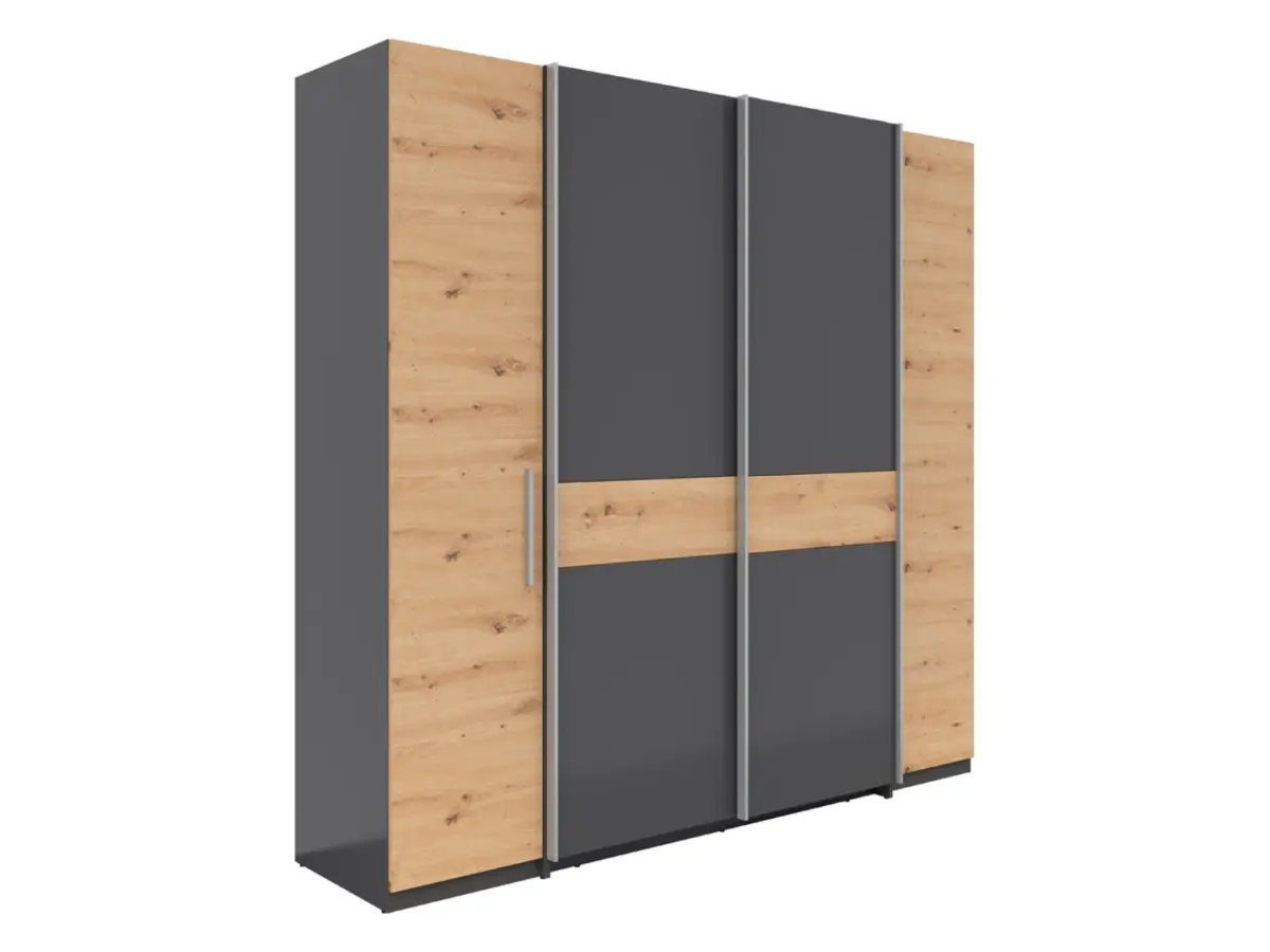 El armario Fabio combina líneas limpias y modernas con una paleta de colores sofisticada: grafito y roble artisan, que crean una armonía cálida y contemporánea. Encaja perfectamente en dormitorios, vestidores o pasillos.