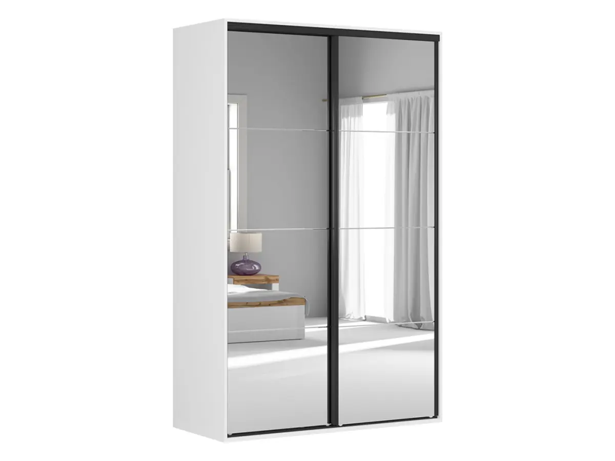 El armario Flex combina una estructura blanca atemporal con dos puertas de espejo enmarcadas en negro: un contraste elegante que aporta carácter sin recargar el espacio. Los listones decorativos rematan el conjunto con un acabado cuidado. Un diseño limpio y expresivo que encaja perfectamente en dormitorios modernos, vestidores o habitaciones juveniles.