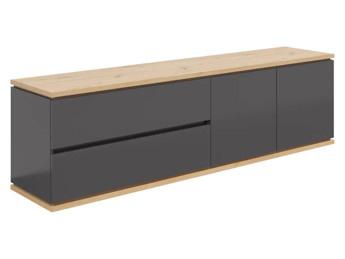 Una encimera amplia y estable para el televisor, los altavoces o la consola. Dispone de dos cajones profundos para mandos y dispositivos que suelen estar dispersos, y estantes tras las puertas ideales para organizar películas, música o videojuegos.