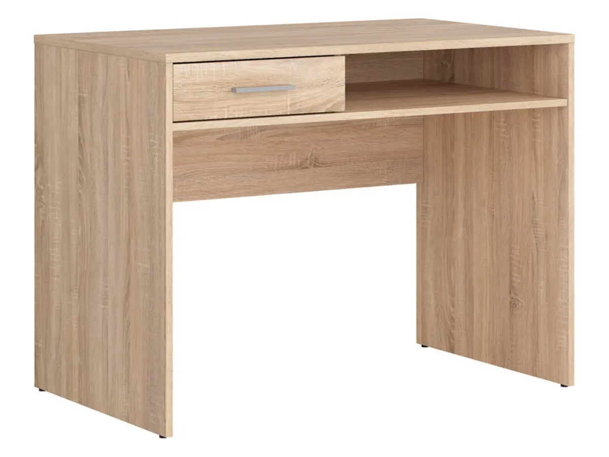 El tablero despejado invita a la concentración: un cajón compacto guarda bolígrafos y accesorios fuera de la vista, mientras que el estante abierto es el lugar ideal para folios o la agenda. El tirador horizontal permite abrir el cajón de forma sencilla e intuitiva.