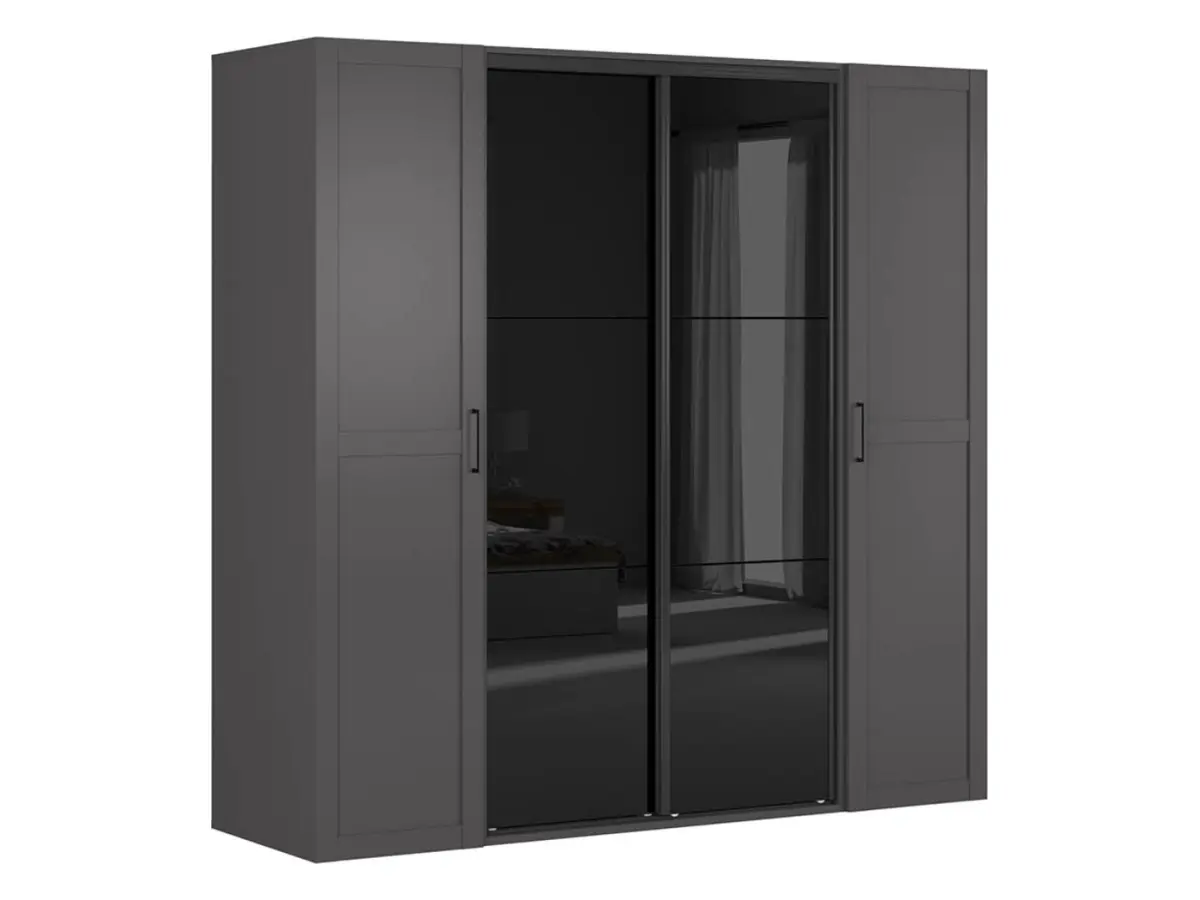 El conjunto de tres armarios Flex combina puertas correderas en negro brillante con puertas abatibles en grafito, creando un juego de contrastes elegante y moderno. Los tiradores negros de líneas limpias rematan el conjunto con discreción. Un mueble que se adapta a cualquier dormitorio o recibidor sin perder su personalidad.