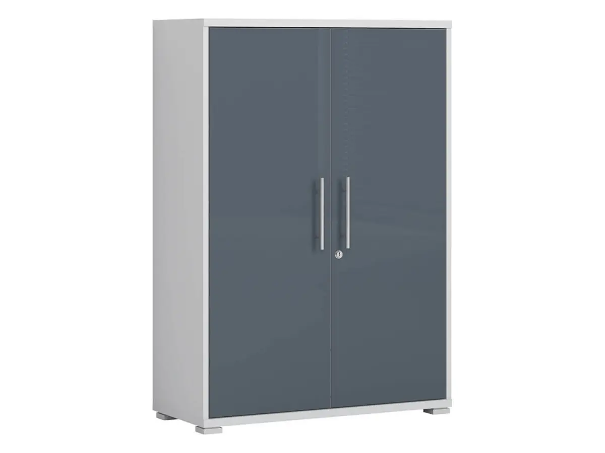 El armario Office Lux combina elegancia y funcionalidad con un acabado sofisticado: cuerpo en gris claro y puertas de cristal lacado en grafito. Los tiradores y patas cromados añaden un toque minimalista que encaja perfectamente en cualquier despacho moderno.