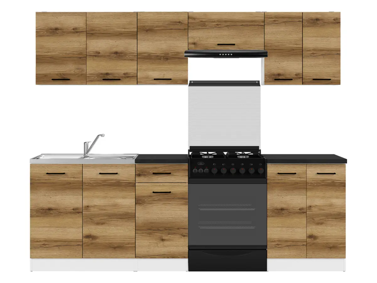 Con 240 cm de ancho total, este conjunto puede ser la solución completa para una cocina pequeña o integrarse en una composición mayor. Su diseño compacto y proporciones equilibradas lo hacen ideal para aprovechar cada centímetro.