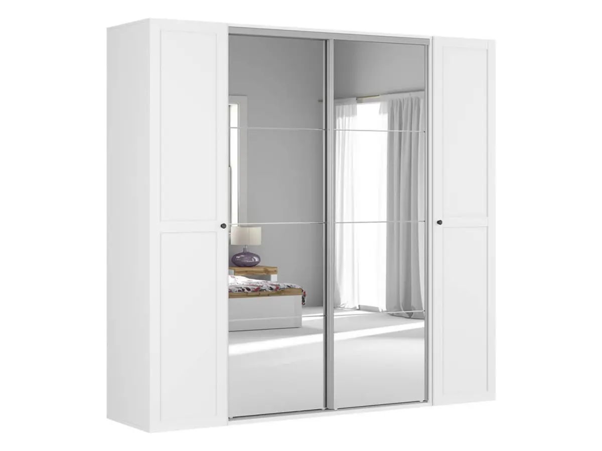 El blanco clásico combinado con un gran espejo de luna crea esa sensación de amplitud y luz que transforma cualquier dormitorio. Los frentes correderos centrales con travesaños decorativos y marco plateado le dan un toque contemporáneo, mientras que las puertas abatibles laterales en blanco con tiradores negros añaden un contraste elegante. Un mueble que encaja igual de bien en un interior nórdico, boho o vintage.