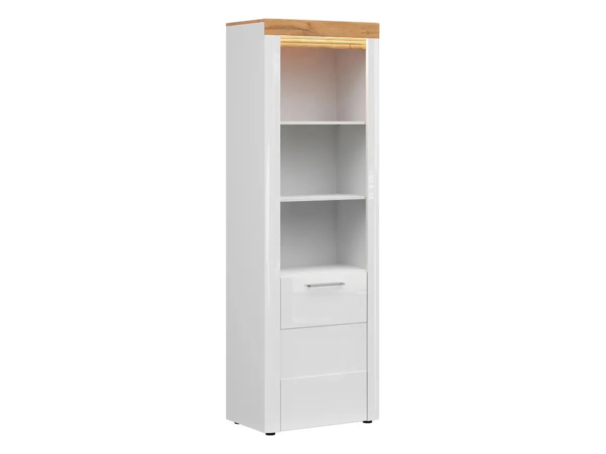 La combinación de blanco brillo y roble grandson aporta a esta estantería un carácter luminoso y contemporáneo. Encaja a la perfección en interiores claros y se adapta tanto al estilo escandinavo como al moderno o retro: ideal para el salón o el dormitorio.