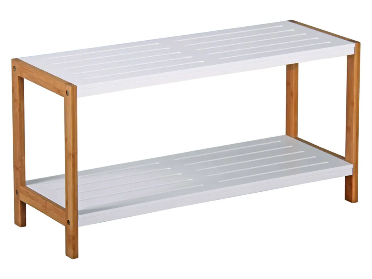 La estructura de bambú aporta la calidez del material natural junto con una resistencia superior a la humedad, ideal para una zona de entrada donde el calzado suele llegar mojado. Las baldas blancas crean un contraste fresco y limpio que encaja perfectamente en interiores modernos y de estilo escandinavo.
