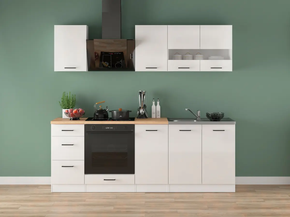 Con 220 cm de anchura total, este conjunto es ideal para cocinas pequeñas, office o pisos de alquiler — compacto en tamaño pero completo en funcionalidad. Ten en cuenta que la encimera y los electrodomésticos no están incluidos.