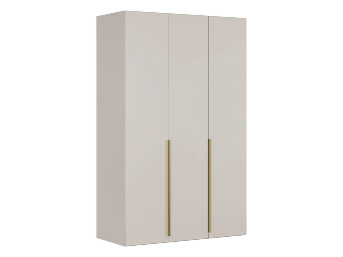 El armario Flex combina un cuerpo en tono cachemira con frentes a juego e interior en gris lino. Los tiradores de canto en oro cepillado aportan ese toque moderno que transforma cualquier estancia.
