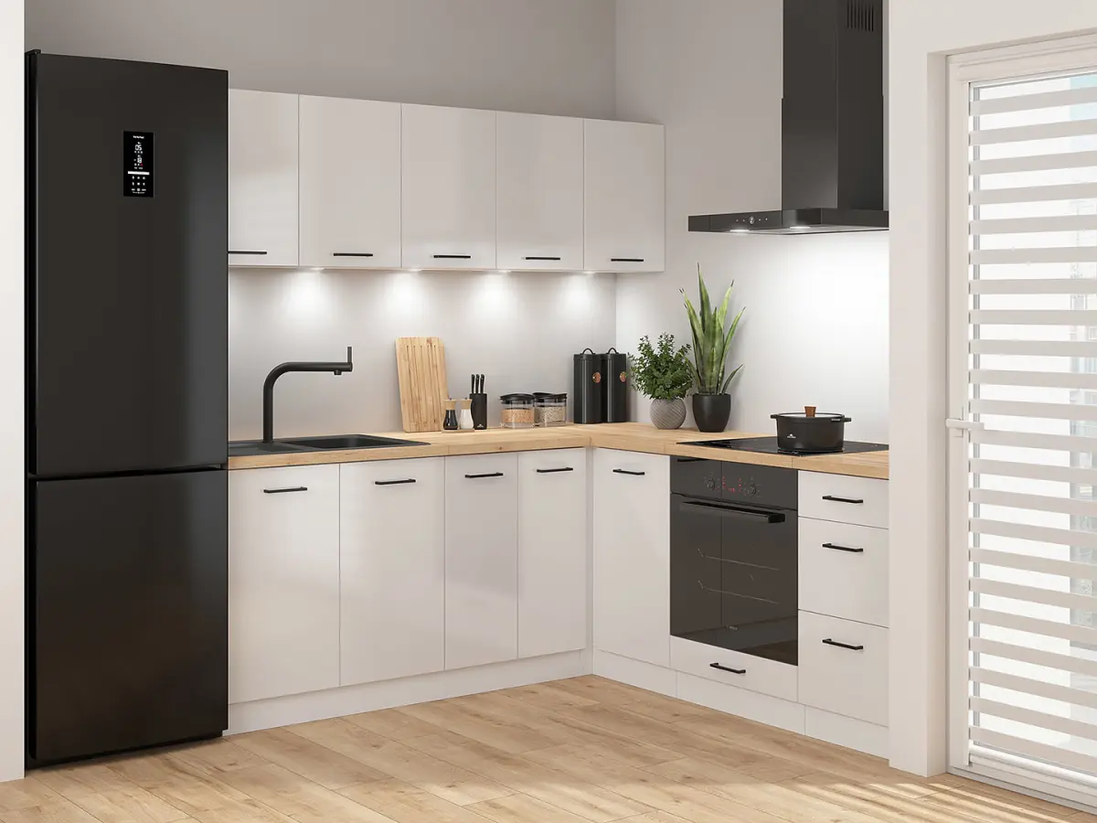 Con sus 200×200 cm, Junona Line aprovecha el rincón de forma eficiente sin desperdiciar ni un centímetro. El conjunto incluye todos los módulos necesarios para disponer de una cocina completa; solo falta añadir la encimera y los electrodomésticos.