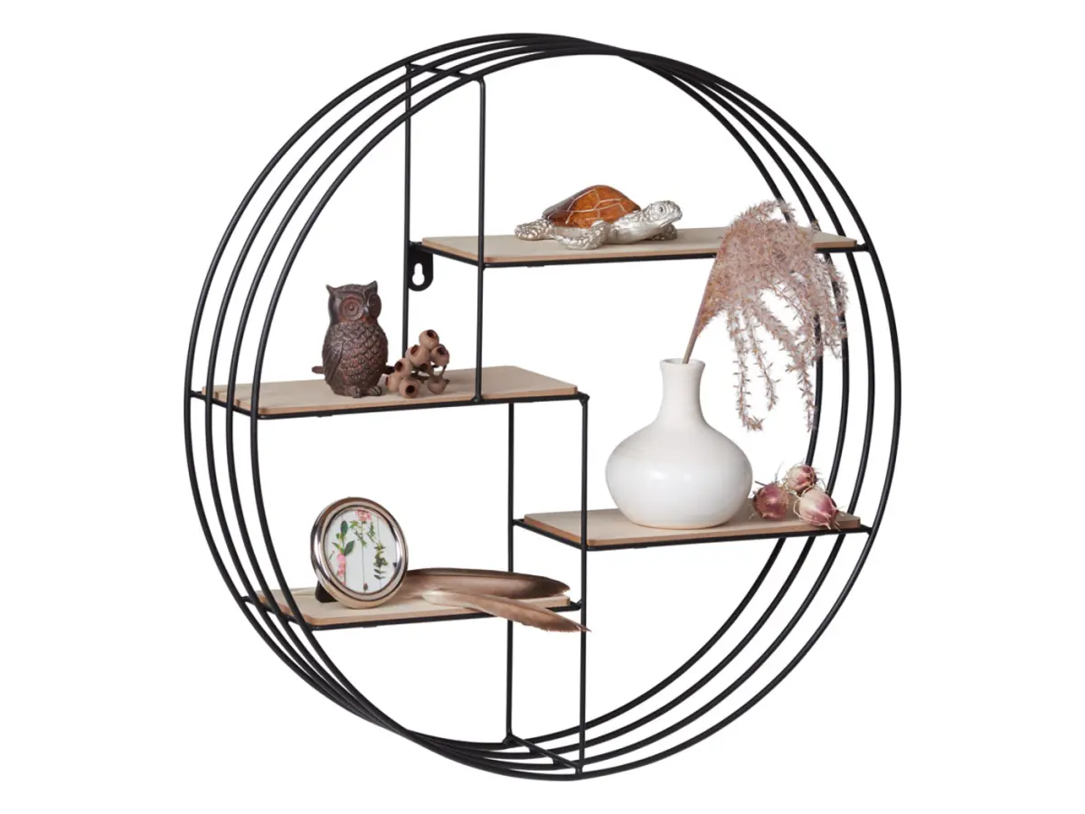 La forma circular del estante Hanna rompe con lo convencional y convierte cualquier pared en un punto focal. Su estructura metálica negra combina con las baldas de MDF en tono natural, logrando un equilibrio entre lo industrial y lo cálido que funciona a la perfección en un salón moderno, un estudio creativo o un dormitorio acogedor.