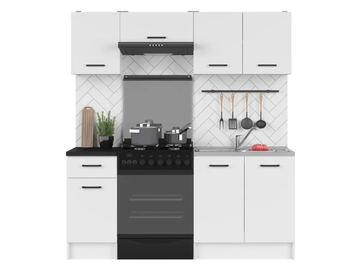 La cocina Sara apuesta por un estilo limpio y atemporal: frentes blancos sobre cuerpos blancos con tiradores negros que aportan el contraste justo. Un acabado minimalista que se adapta a cualquier decoración, desde estilos modernos hasta ambientes nórdicos.