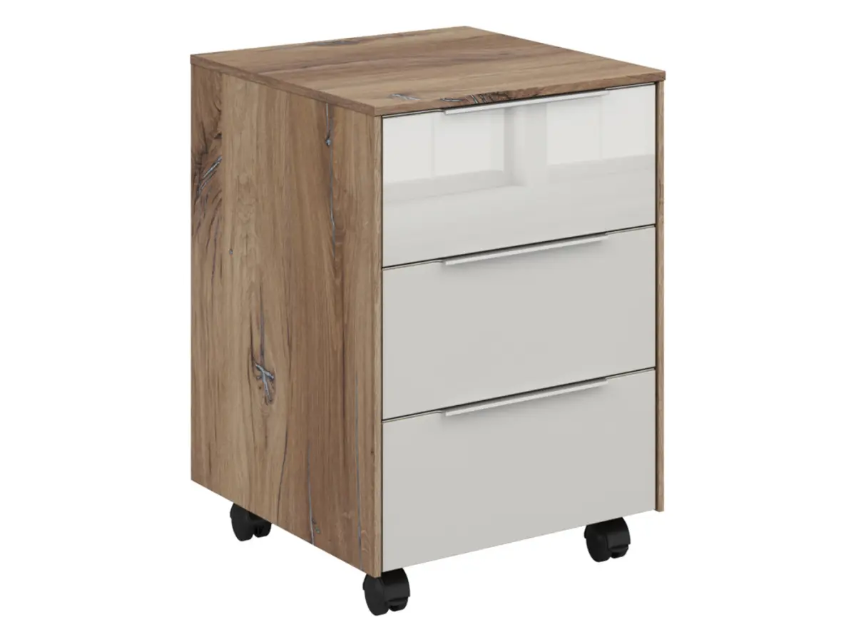 La cajonera Nevada combina dos acabados que se complementan a la perfección: el cuerpo en roble Flagstaff oscuro aporta calidez y carácter moderno, mientras que los frentes de los cajones en vidrio lacado gris seda añaden ligereza y un toque contemporáneo. Un mueble que cuida la armonía visual de tu espacio de trabajo.