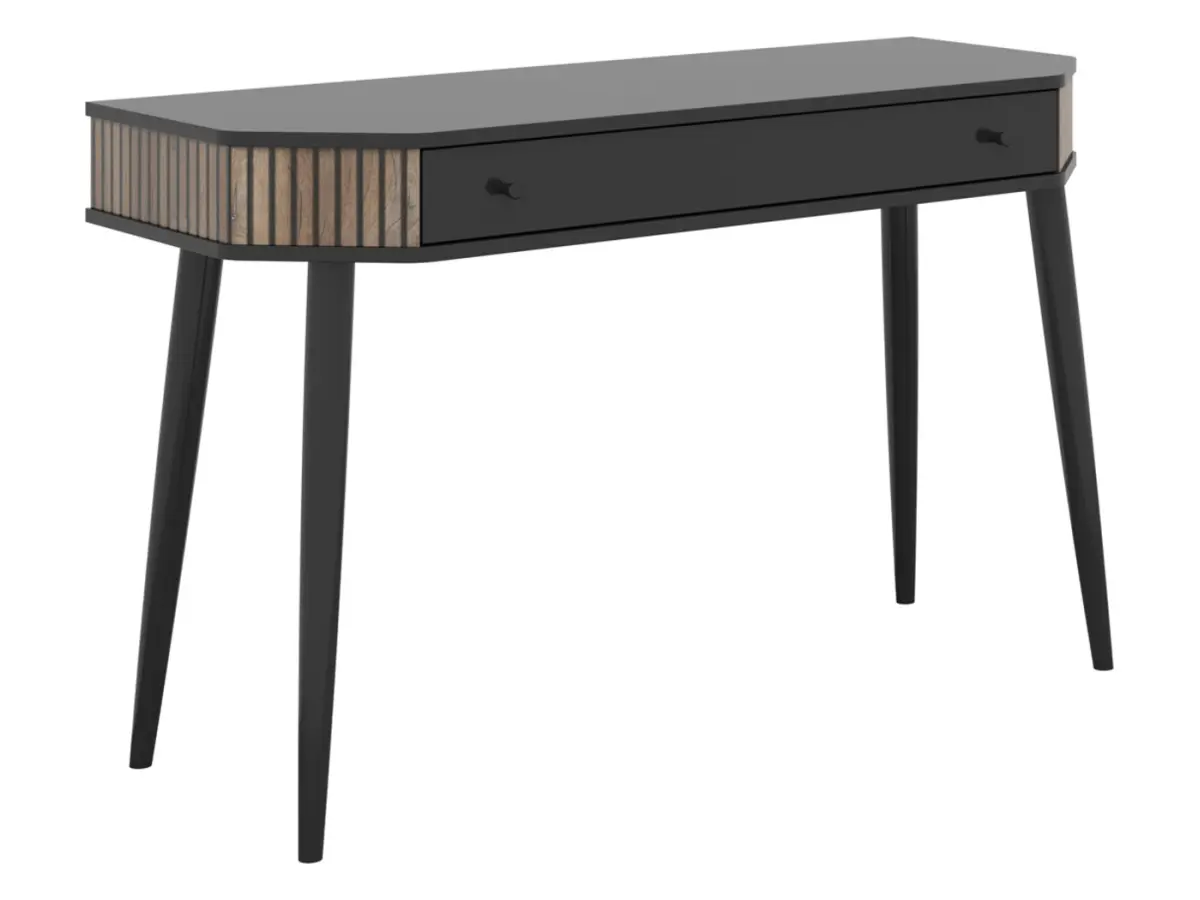 El tocador Capri combina una estética ligera y moderna con un acabado atemporal. El tablero negro contrasta con elegancia con los detalles en roble oscuro Flagstaff, mientras que las patas de madera lacadas en negro aportan ese toque cálido tan característico del estilo escandinavo. Encaja perfectamente tanto en el dormitorio como en el recibidor.