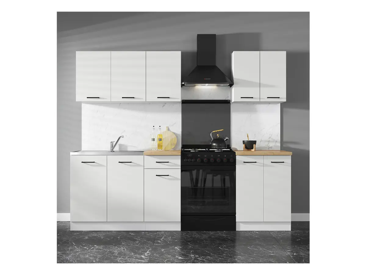 Con 180 cm de ancho, este conjunto está diseñado para sacar el máximo partido a cada rincón. Los amplios armarios superiores permiten organizar la vajilla, vasos y alimentos, mientras que los módulos inferiores tienen capacidad para ollas, sartenes y demás utensilios. Todo tiene su lugar.